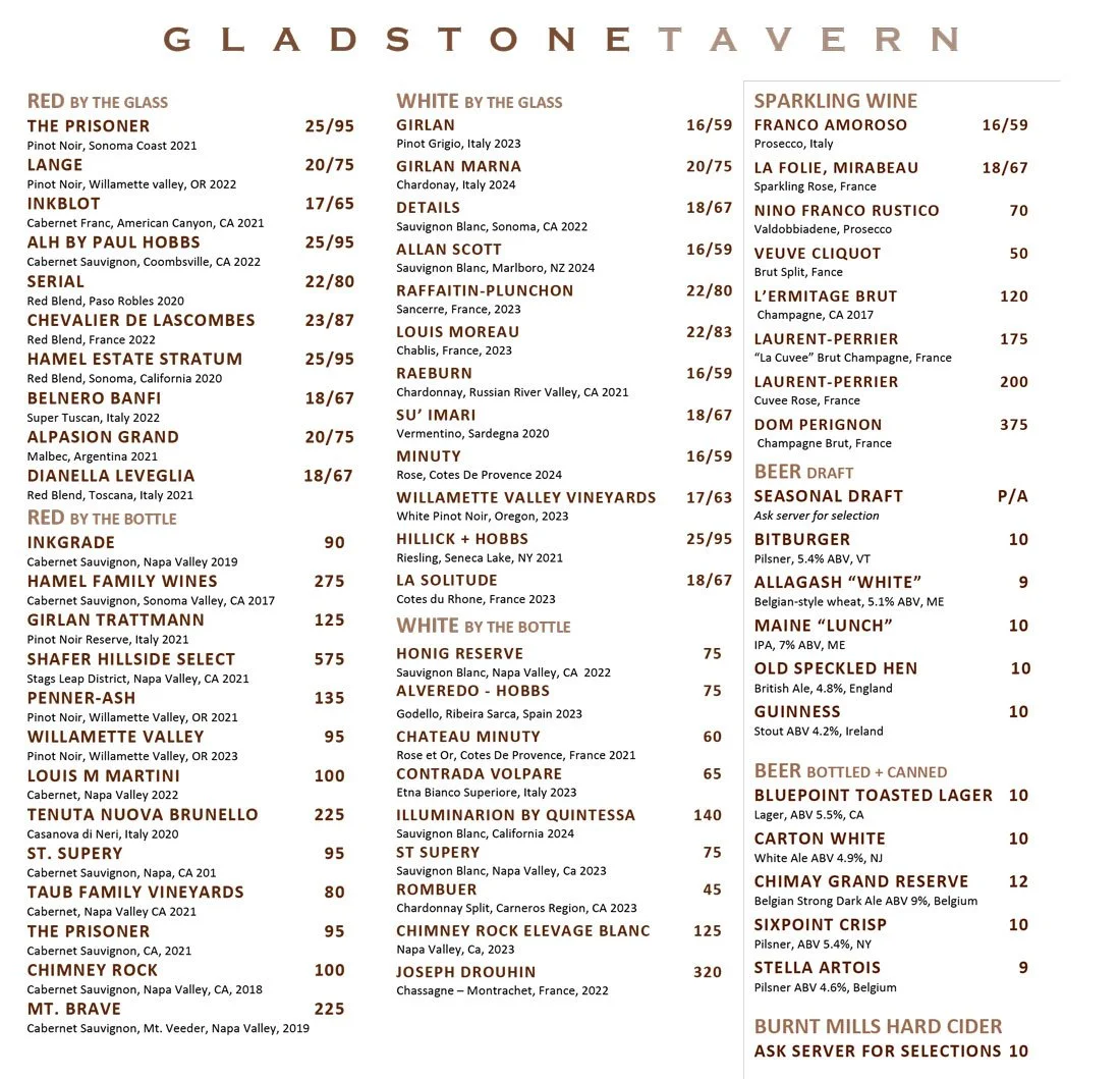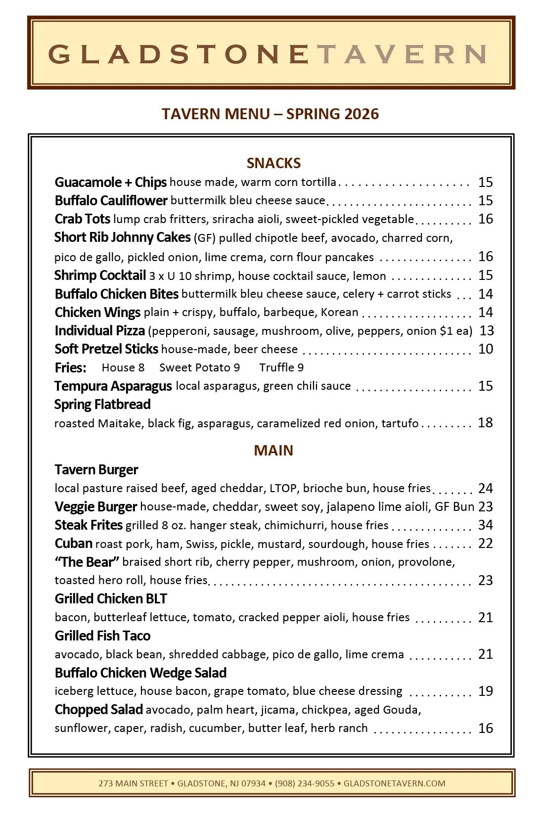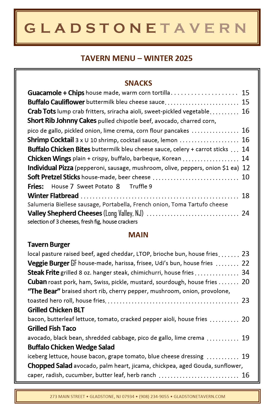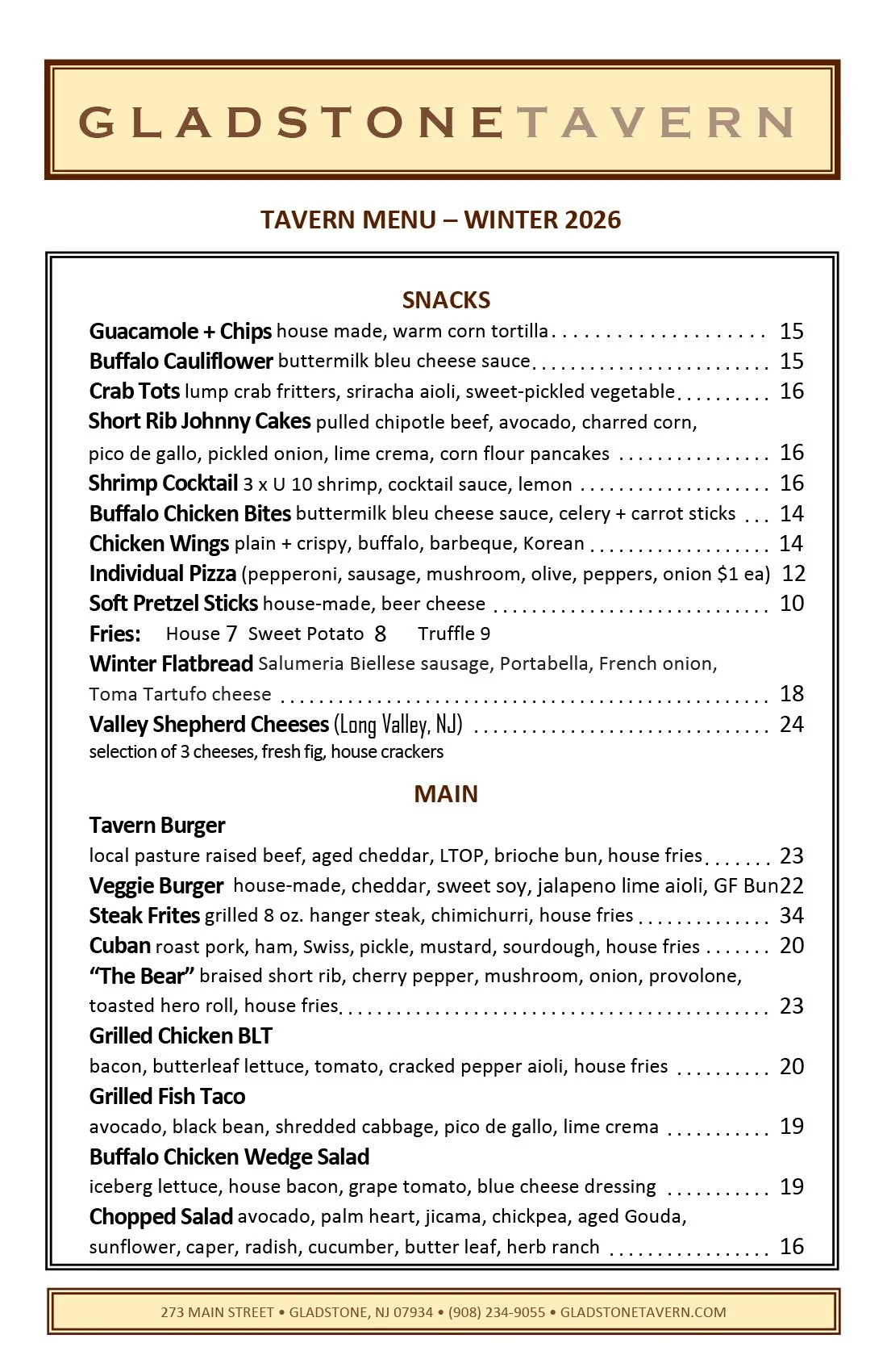 Our menus change often, with the seasons and availability. Menus and pricing are subject to change. Please call the Tavern for menu updates and daily features.
